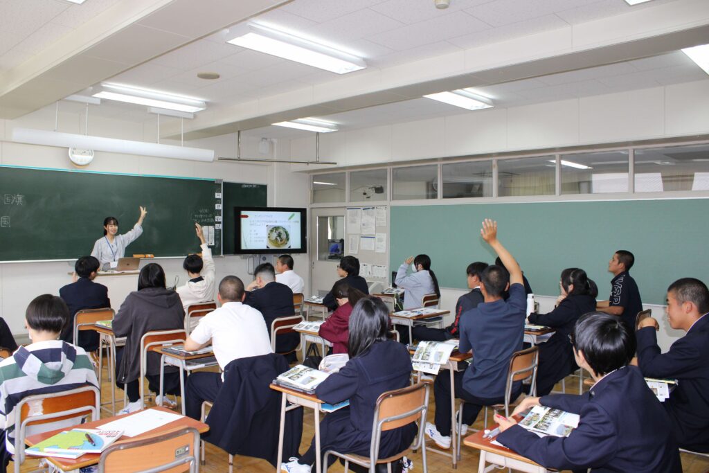 (北海道鵡川高等学校の教壇に立つ金石さん)