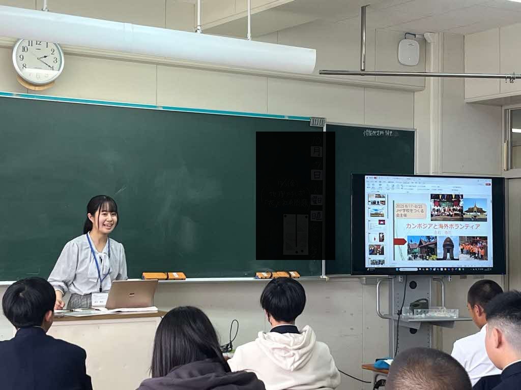 活動内容は高校魅力化の推進です。活動期間中、地理の授業でカンボジアで行ったボランティア活動(ブランコの製作や小学校との交流)の報告を行ったときは、文化の違いどころか、国の場所すら知らない生徒がいましたが、最終的にはカンボジアが身近になったと反響を頂きました。